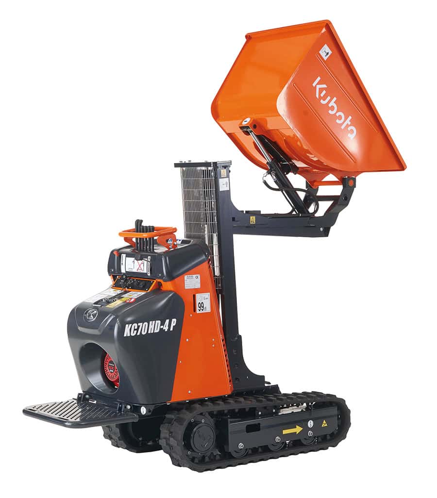 Compact, powerful and designed for optimum comfort and fuel efficiency, Kubota KC70-4 tracked dumpers make it easy to transport up to 700kgs of materials. The five variants include the standard model (KC70H-4), a variable undercarriage model (KC70HV-4), a high dump version (KC70HD), a version with a self loading shovel (KC70SL-4), and a variant that includes both a variable undercarriage and a self-loading shovel (KC70VSL).